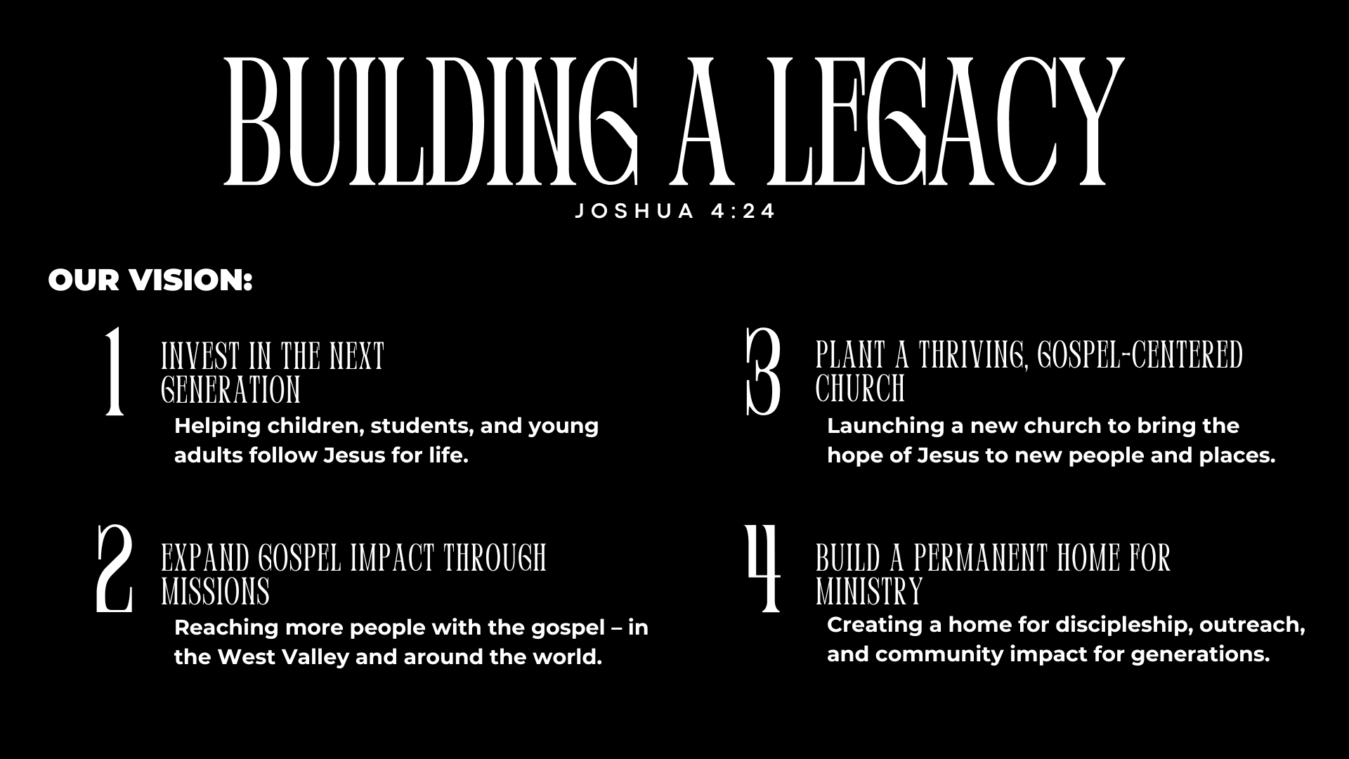 This year, for our 10th Anniversary as a Church, we are challenging our people to take a step of faith this year to build a lasting legacy here at Mission. Our goal is to raise $3 million to prepare for what God has in store for us. We hope you will pray and see how God leads you to participate in what He is doing.